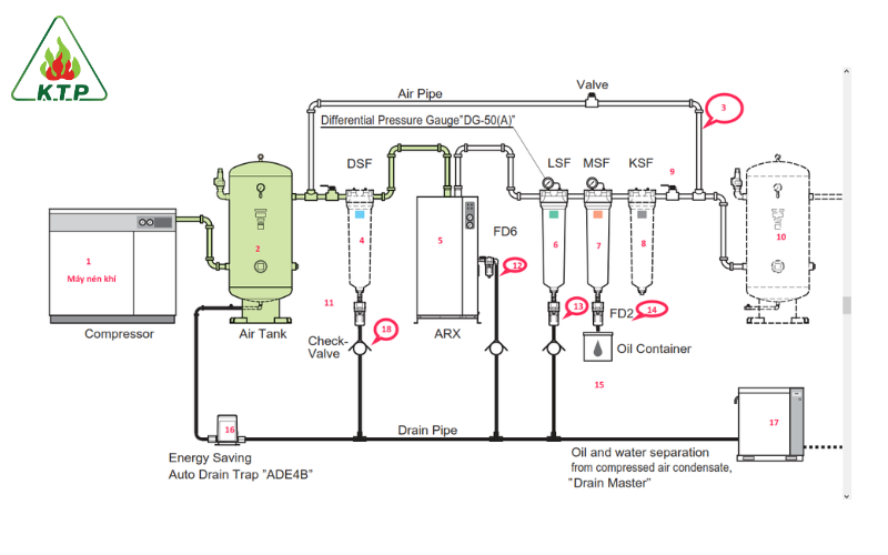 Thiết bị xử lý khí: Bao gồm một loạt các bộ phận như bộ lọc khí đầu vào, hệ thống làm mát sau nén, thiết bị sấy khô và bẫy lọc độ ẩm. Hệ thống này có nhiệm vụ loại bỏ tối đa các tạp chất, hơi nước có thể gây ăn mòn và gỉ sét trong đường ống cũng như các bộ phận điều khiển.