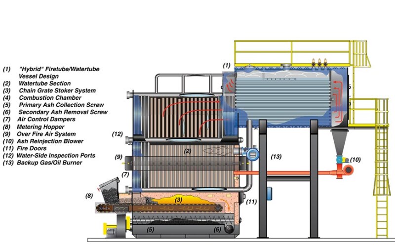 Dưới đây là các bộ phận chính và chức năng của từng hệ thống trong lò hơi đốt than: